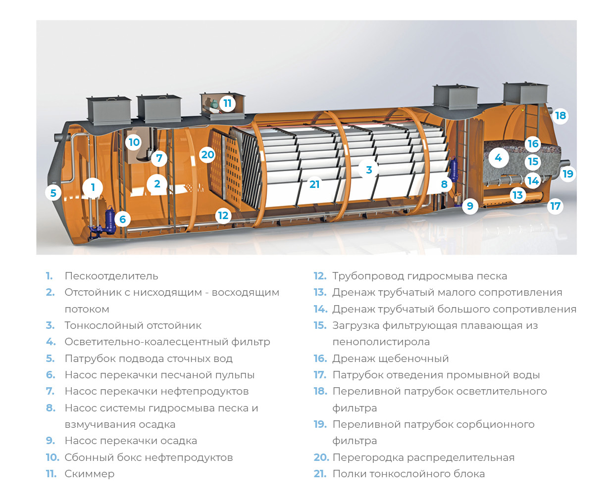 - Пескоулавливание. Задержание минеральных примесей, преимущественно песка (аккумулирующий резервуар или блок очистки).